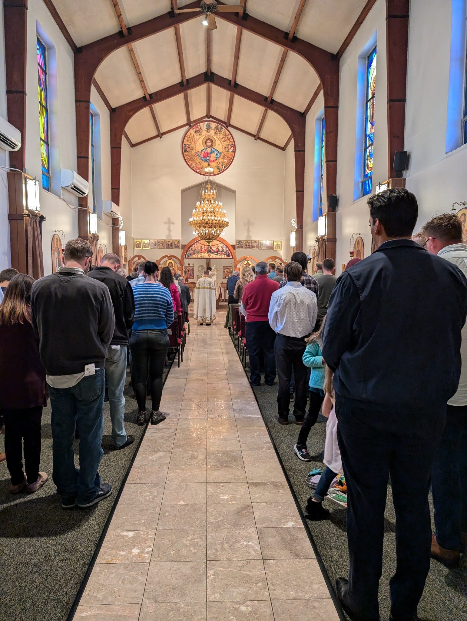 After venerating the icons in the narthex, I kiss him quickly as I pass him by (since I won’t see him until much later in the evening) and go up to my second-row seat to get my recording equipment ready. I do all the recording in the parish (Continuing Orthodox Education between Orthros —morning prayers— and the Divine Liturgy as well as the homily) and all the parish’s social media posts. Right after the Eucharist is distributed but before the Divine Liturgy is concluded, I leave, having received a blessing from the parish priest, Father Jeffrey, in the communion line.