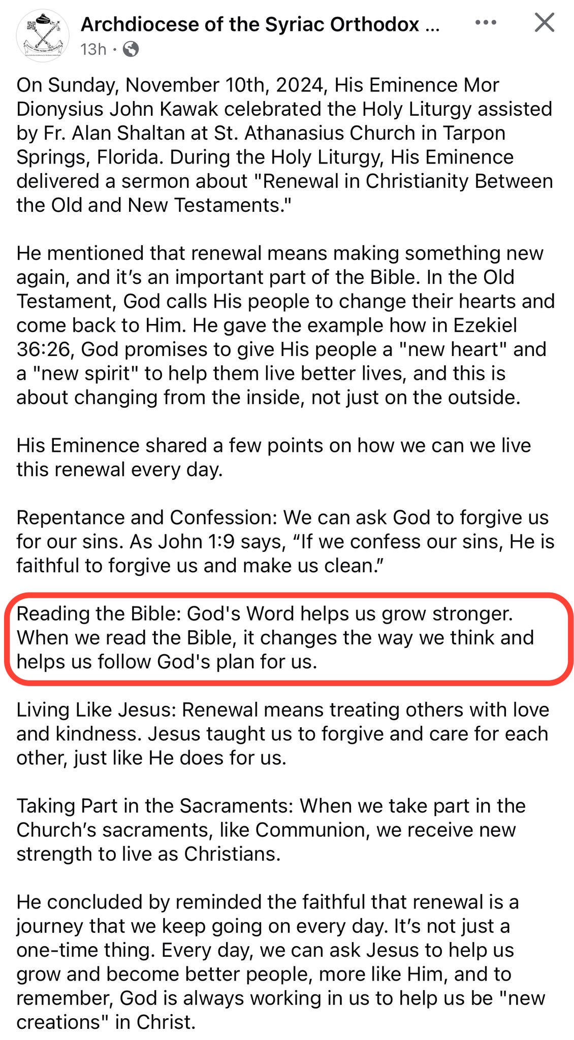 Just yesterday, I saw the archbishop of our Eastern diocese, H. E. Mor Dionysius John Kawak, post about a recent homily in which he spoke of renewal. In it, one of the points he stressed was reading the Bible. It was not the only point, but it was clearly an important one to make.